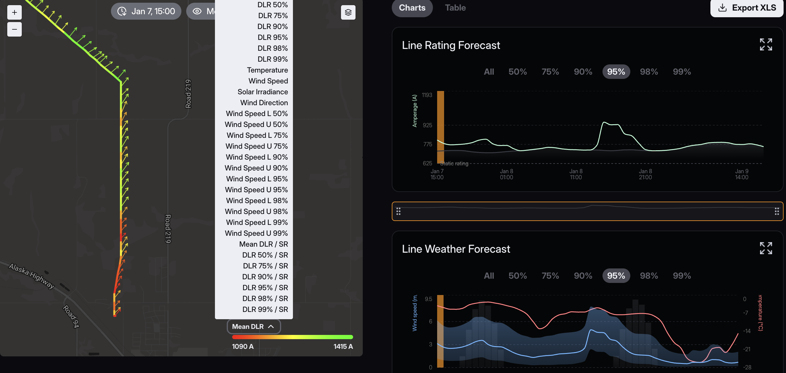 Screenshot of Gridraven Claw showing the span-level DLR prediction (left) and the line-level line rating and weather forecast (right).