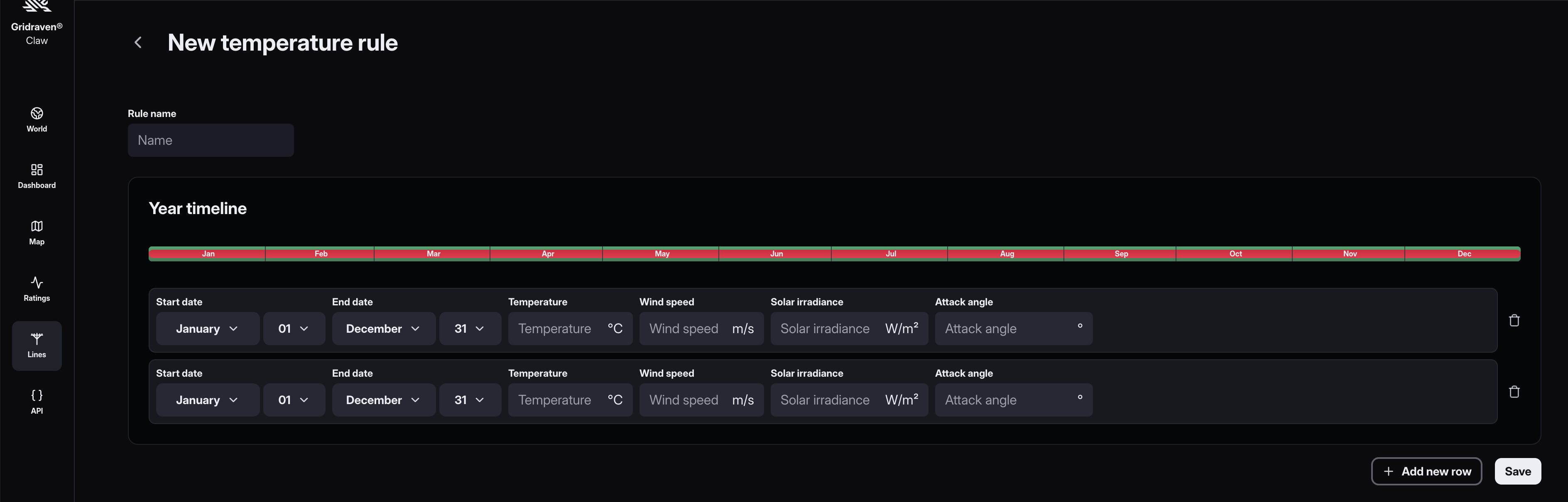 - To add a new temperature rule, click on the "New temperature rule" button and then "Add new row". Fill in the data and click the "Save" button
