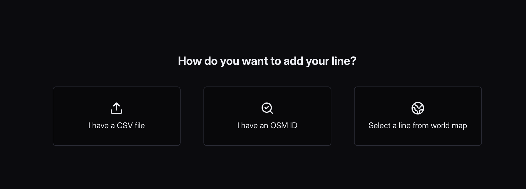 First you need to choose if you have a csv file for adding new line or you can add it from Openstreetmap as it’s described in section 2.3 (by choosing the file from map or adding OpenStreetMap ID) or you can pick a line from the map.