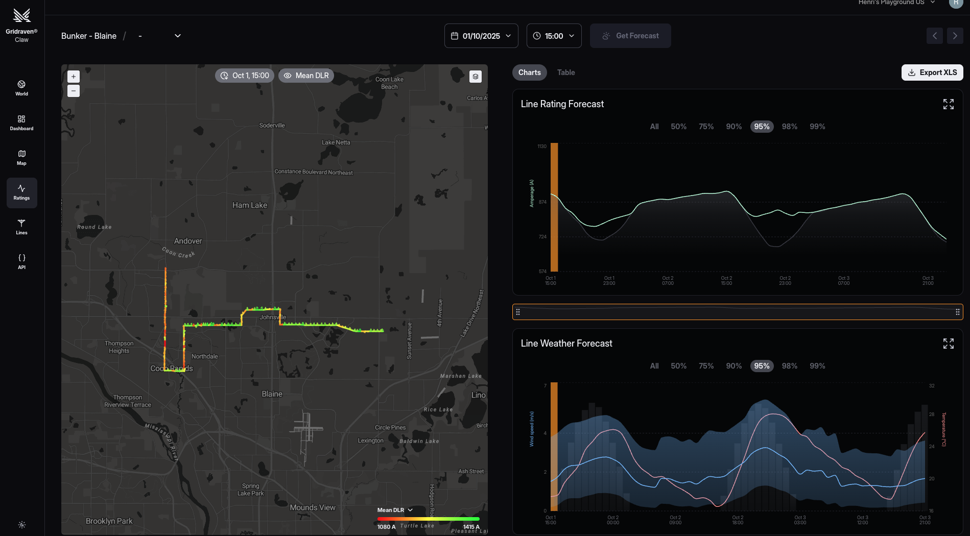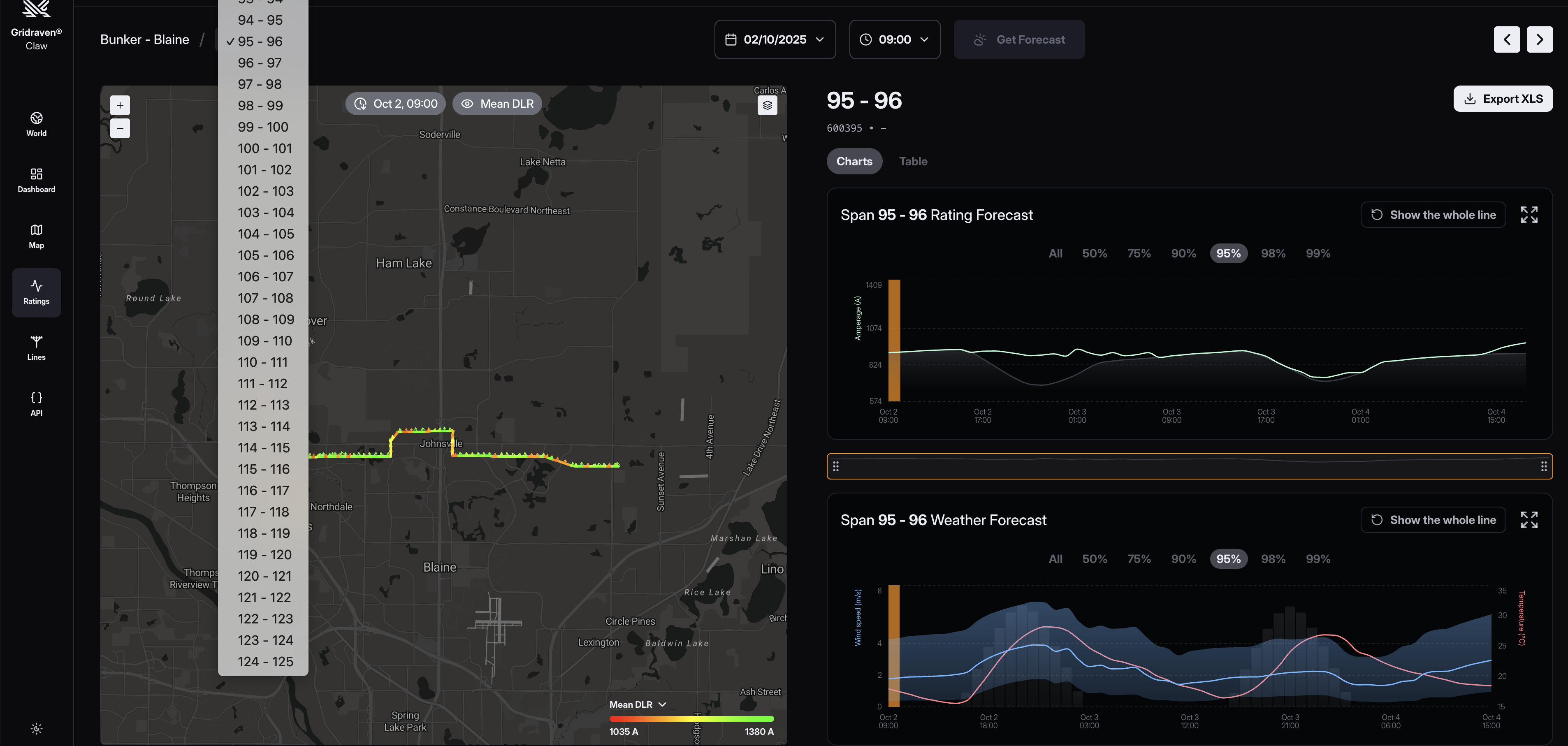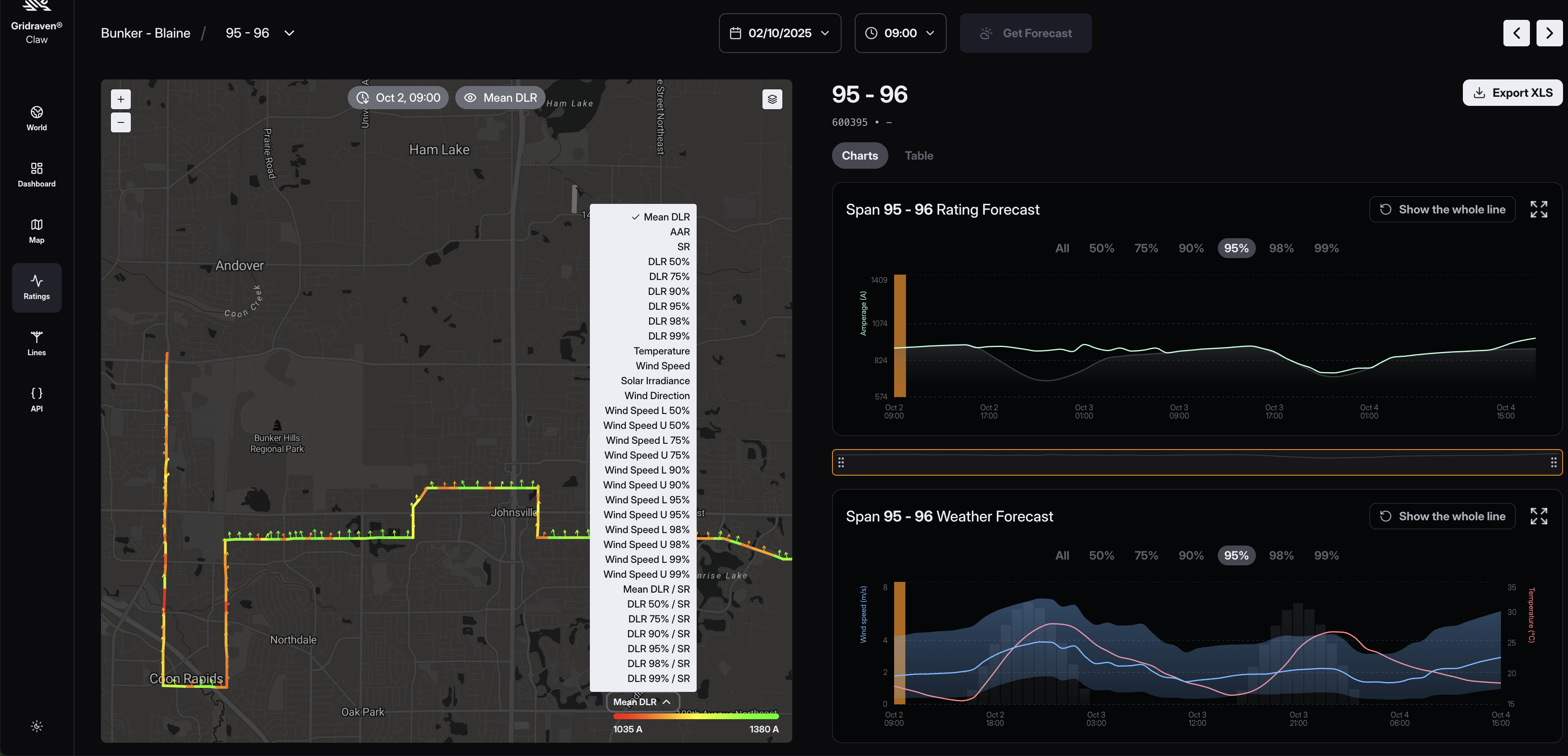 - Line Rating Forecasts: Get forecasted ratings for a specific power line up to 10 days ahead.
