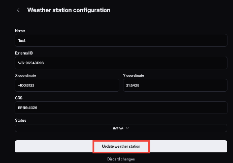 After modifying the weather station configuration, click the “Update weather station” button:
