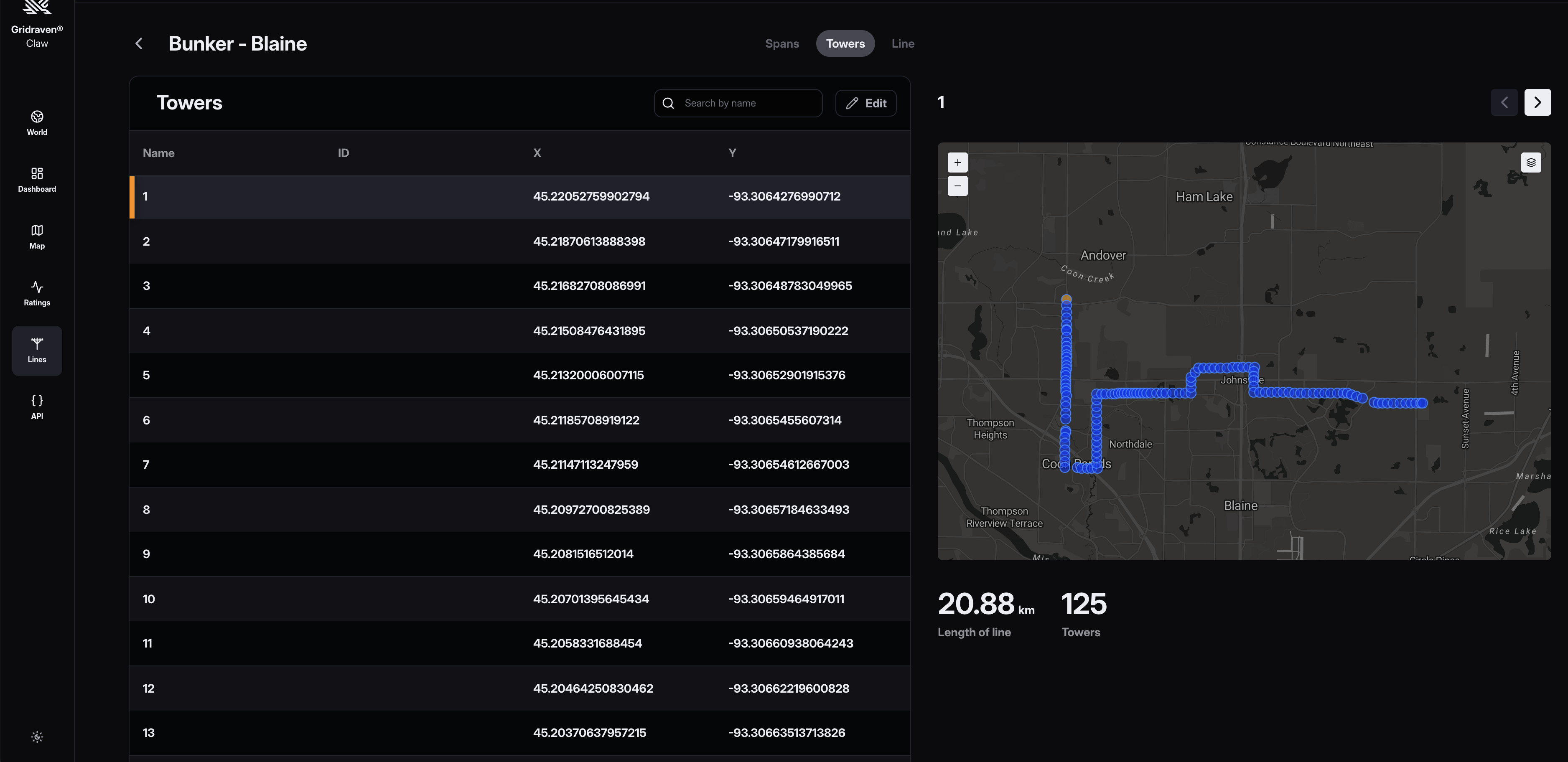 - Towers View: Displays all towers for the line, including Name, X, Y. The map on the right allows zooming to each tower.