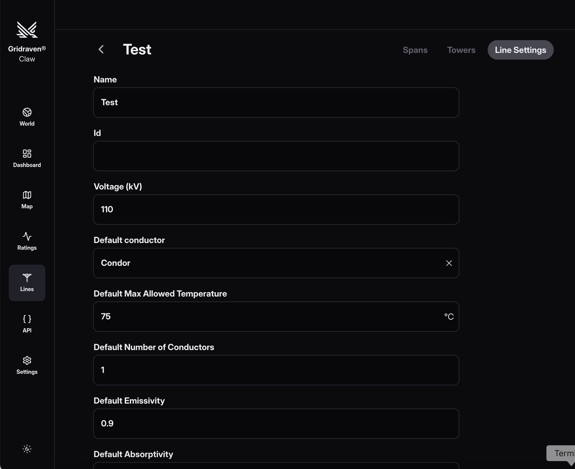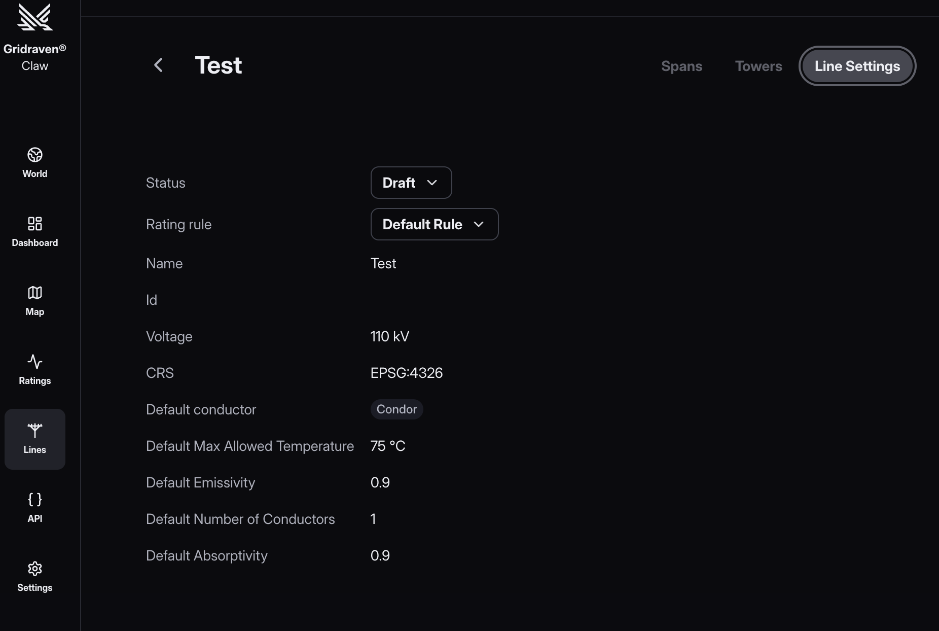 - Edit Line: Click "Edit Line" to modify line details (e.g., Name, Voltage, CRS, Default Conductor Type, Default max allowed Temperature, Default Emissivity, Default Number of Conductors, Default Absorptivity) and save changes: