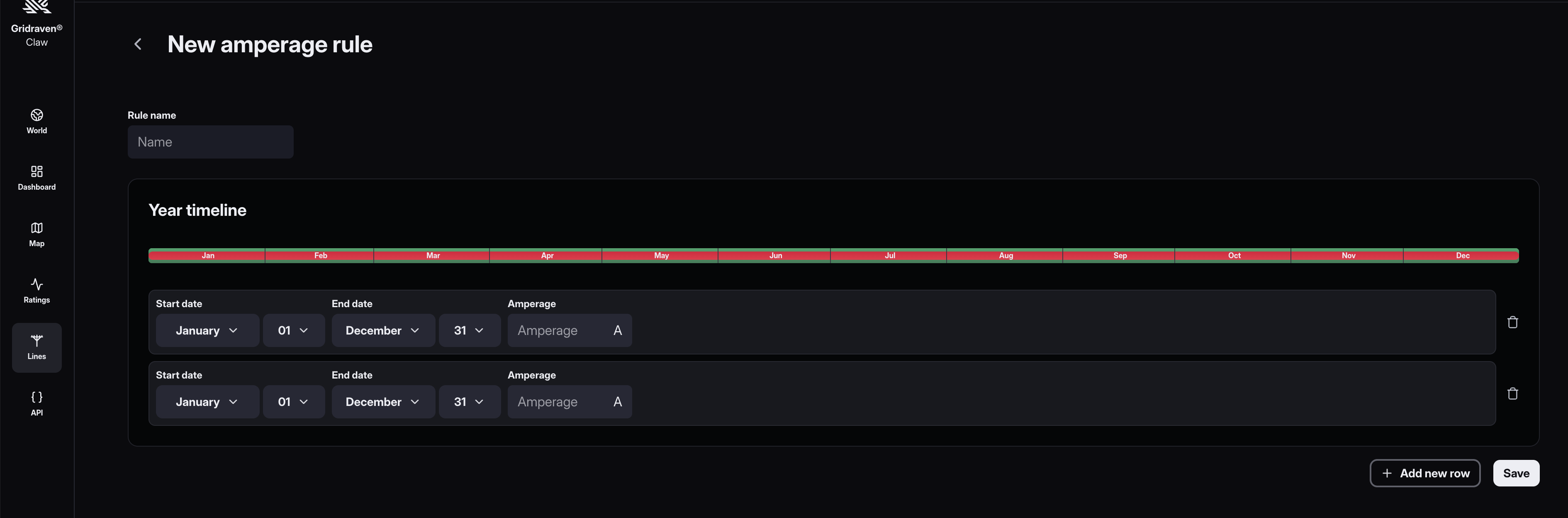 - To add a new amperage rule, click on the "New amperage rule" button and then "Add new row". Fill in the data and click the "Save" button.