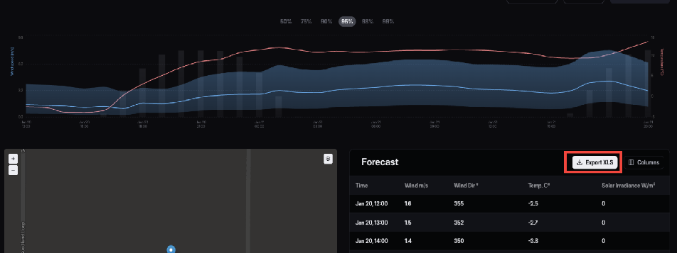 On the Forecast detailed view you can see map view, the Weather Forecast graph and hourly forecast table. You can select a timestamp (described in section 2.6.1) and modify the DLR % value above the ratings graph