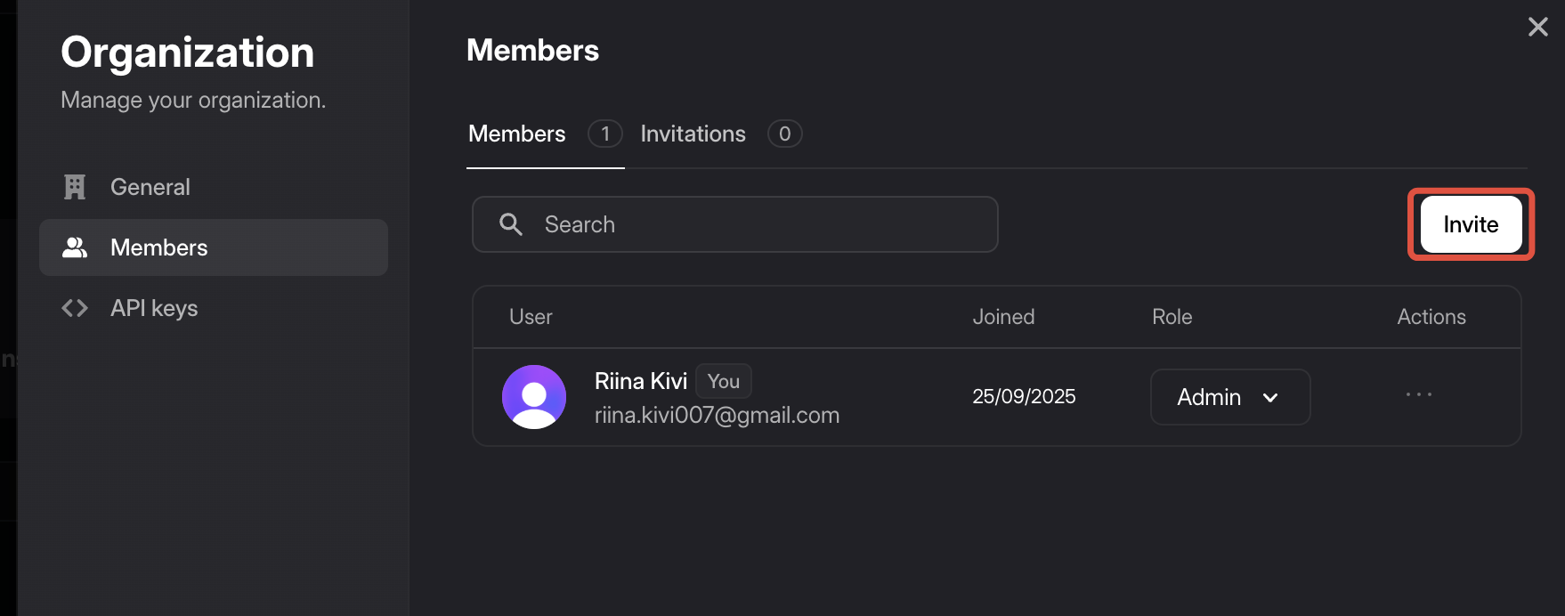 - If you have an admin role, you can add new users by clicking the "Invite" button: