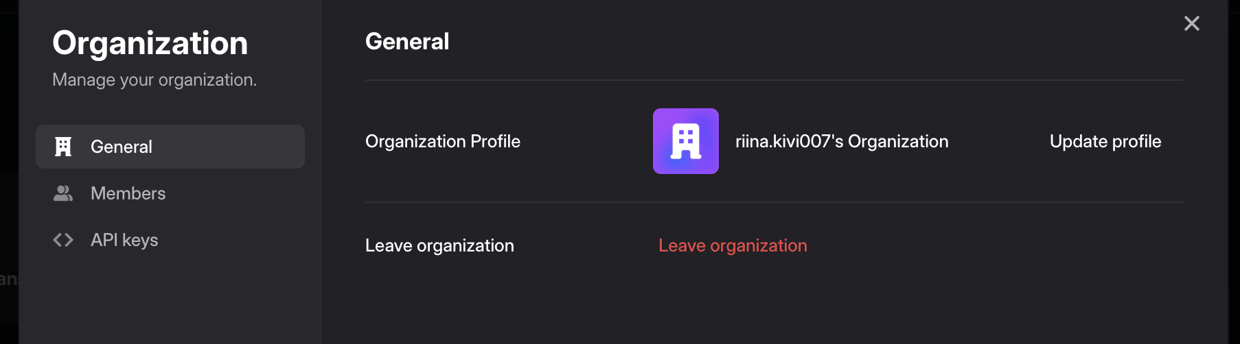 Organization members can manage their organization profile and members by clicking the checkmark icon next to the organization name in the top-right corner and selecting "Manage":