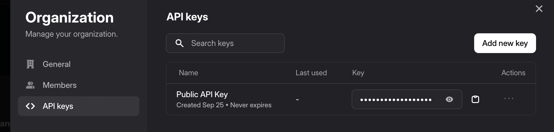 - By clicking on the "Add new key" button, you can create a new API key.