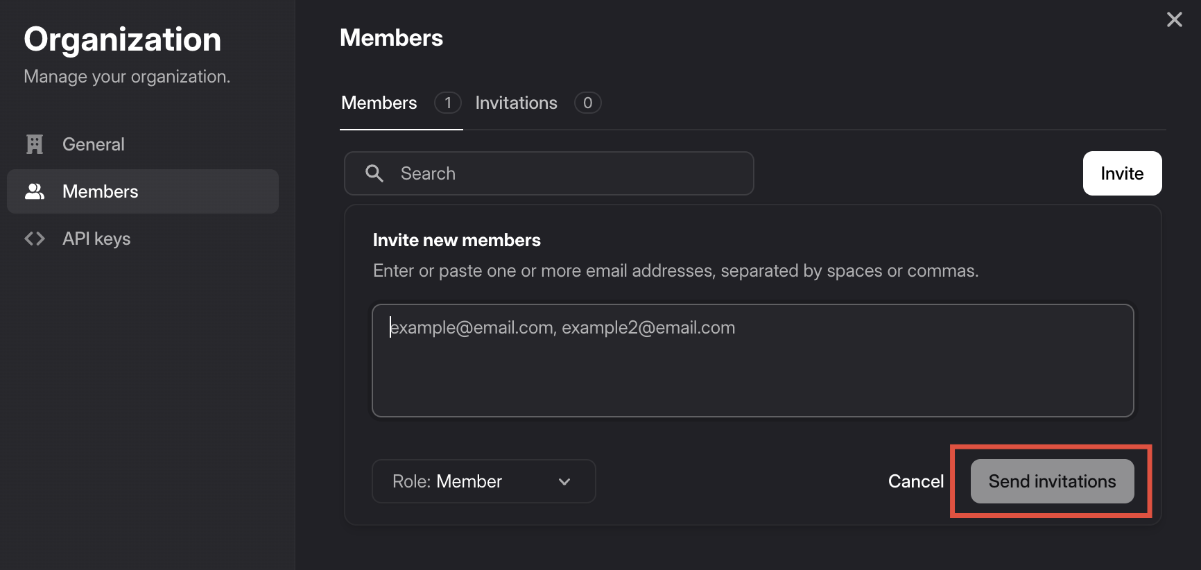 - Enter the new user’s email address and click the "Send invitations" button.