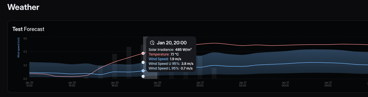 - Weather forecast graph shows data from now up to the next 3-6 days. There you can see aggregated values as solar irradiance, temperature, wind speed