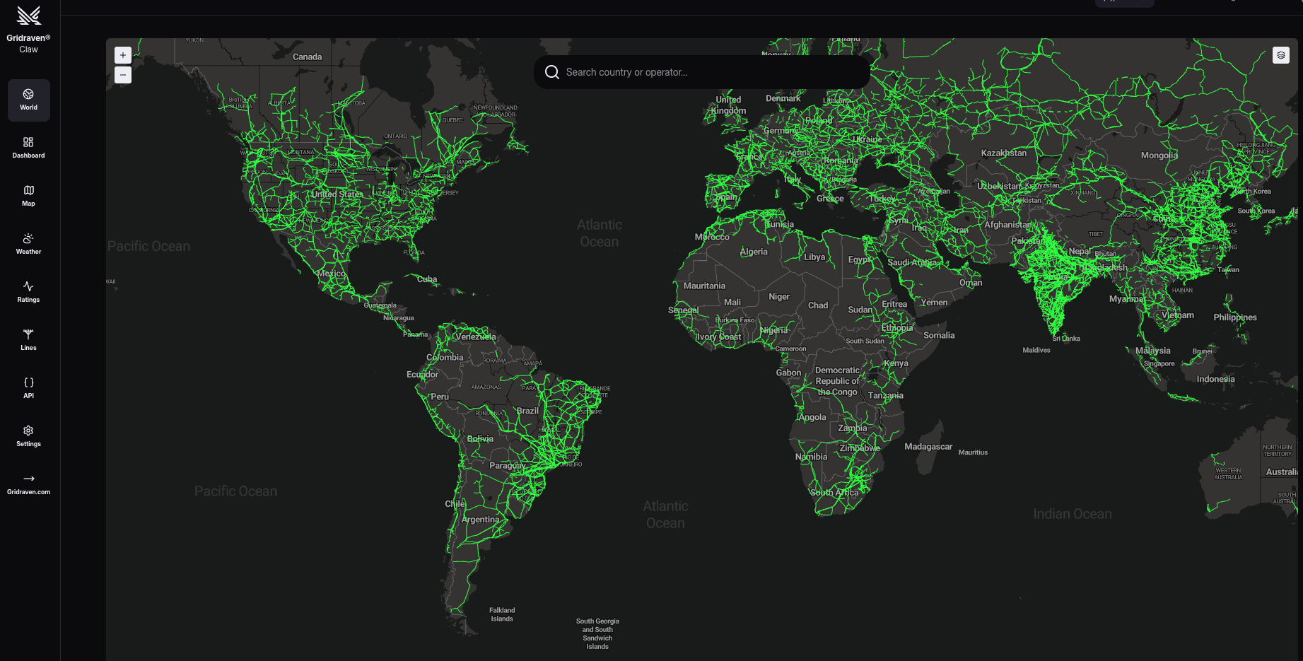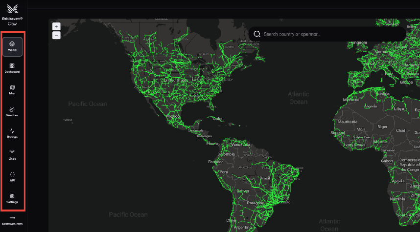 The World tab features a world map displaying electrical lines based on OpenStreetMap.com data.